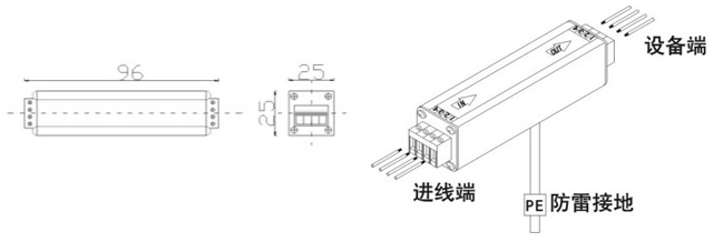 在被保護(hù)設(shè)備的線路接口前段串聯(lián)接入避雷器,“OUT”為設(shè)備端、“IN”為進(jìn)線端,將避雷器接地端與防雷地線(推薦接地電阻≤4Ω)作良好的電氣連接。